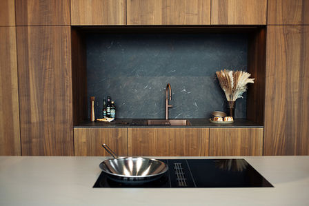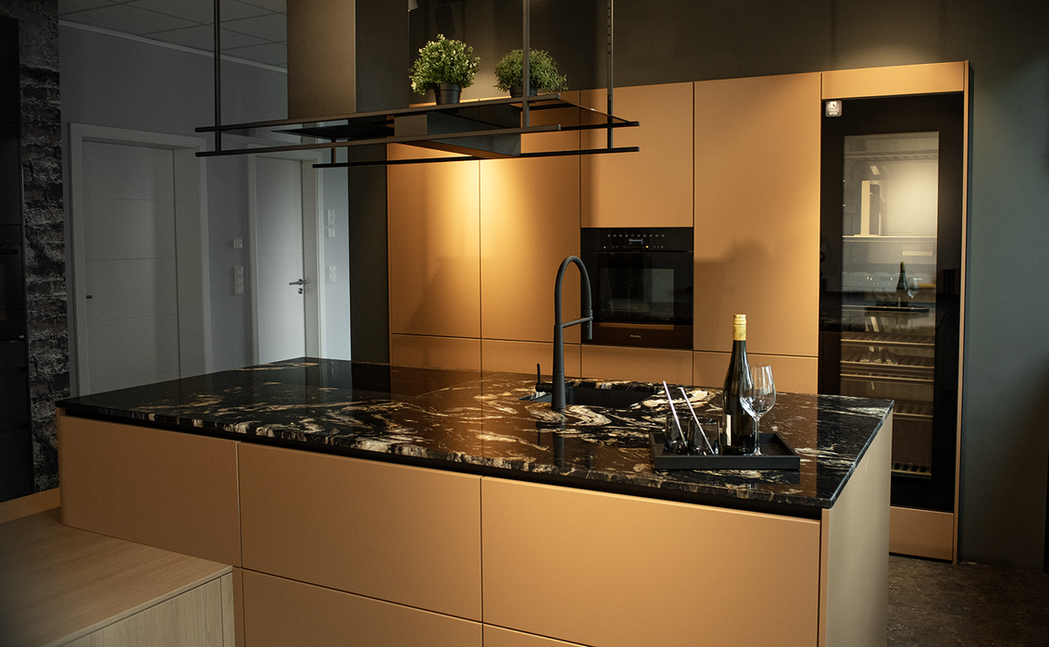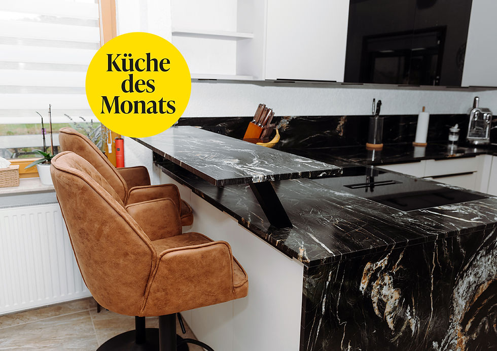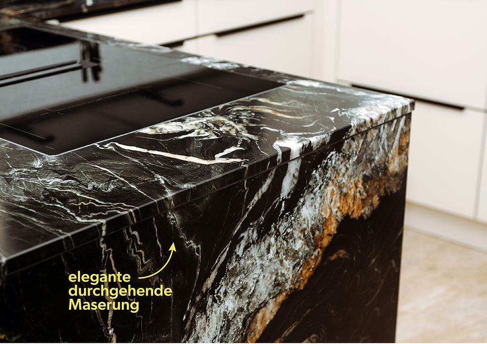 Ein echtes Highlight ist die Naturstein- Arbeitsplatte in Belvedere, die mit ihrer eleganten Maserung beeindruckt. Besonders raffiniert: Die seitliche Wange in Steinoptik, deren Maserung nahtlos in die Arbeitsplatte übergeht – ein Designstatement mit viel Liebe zum Detail. Abgerundet wird das Ensemble durch eine erhöhte, kleine Tischplatte im gleichen Material wie die Arbeitsfläche – ideal für einen stilvollen Frühstücksplatz oder den schnellen Kaffee zwischendurch.